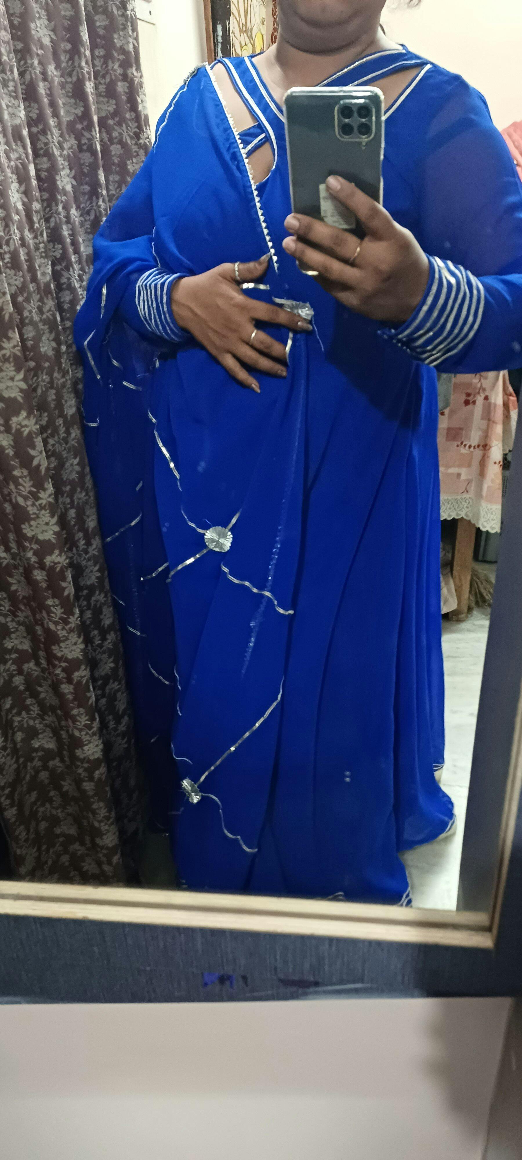 - Anarkali has regular sleeves with multiple gotapati layers near the cuff.