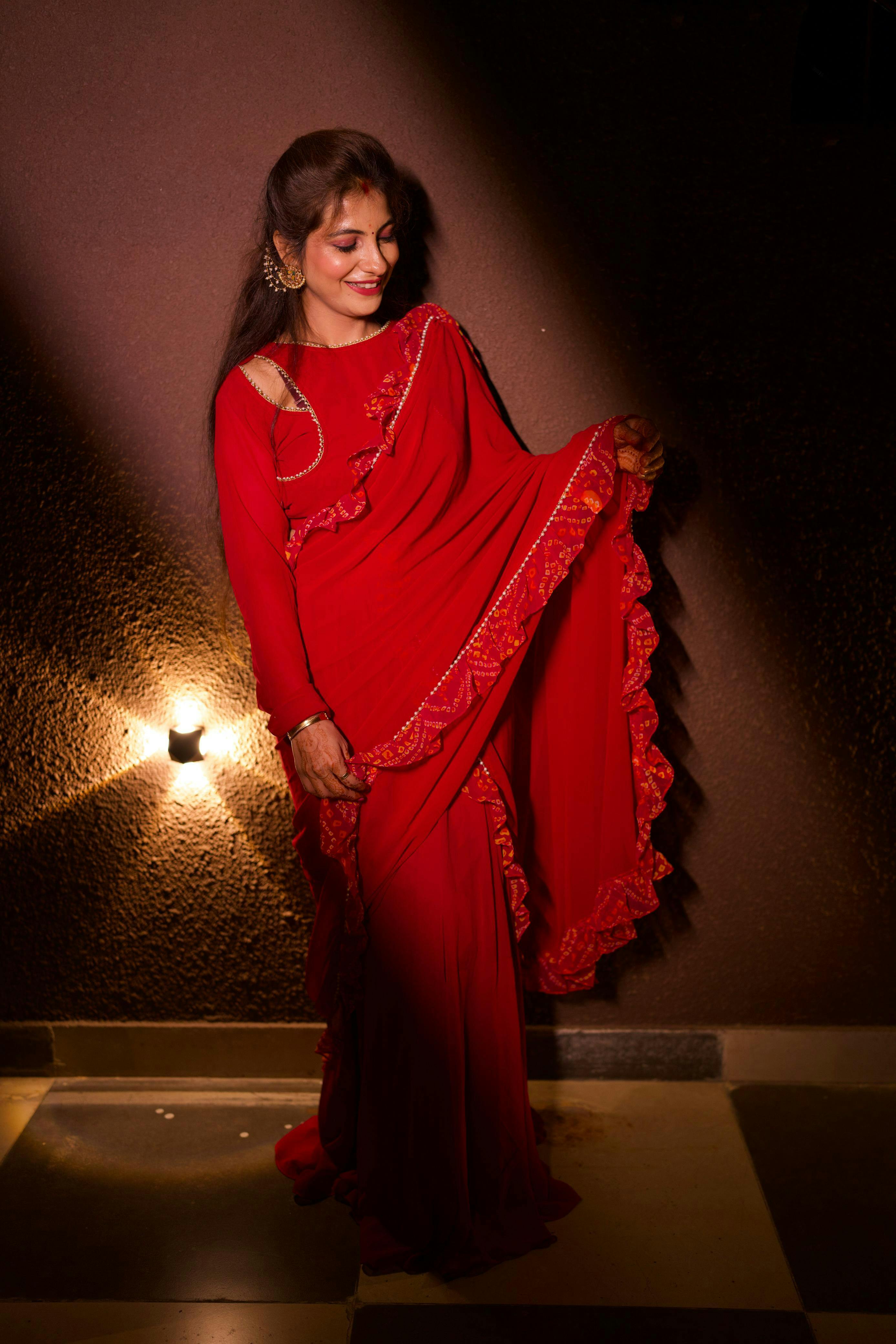 Paired with dupatta, rich in bandhani frill detailing and pearl lace, prepare to steal everyone’s attention in this one.